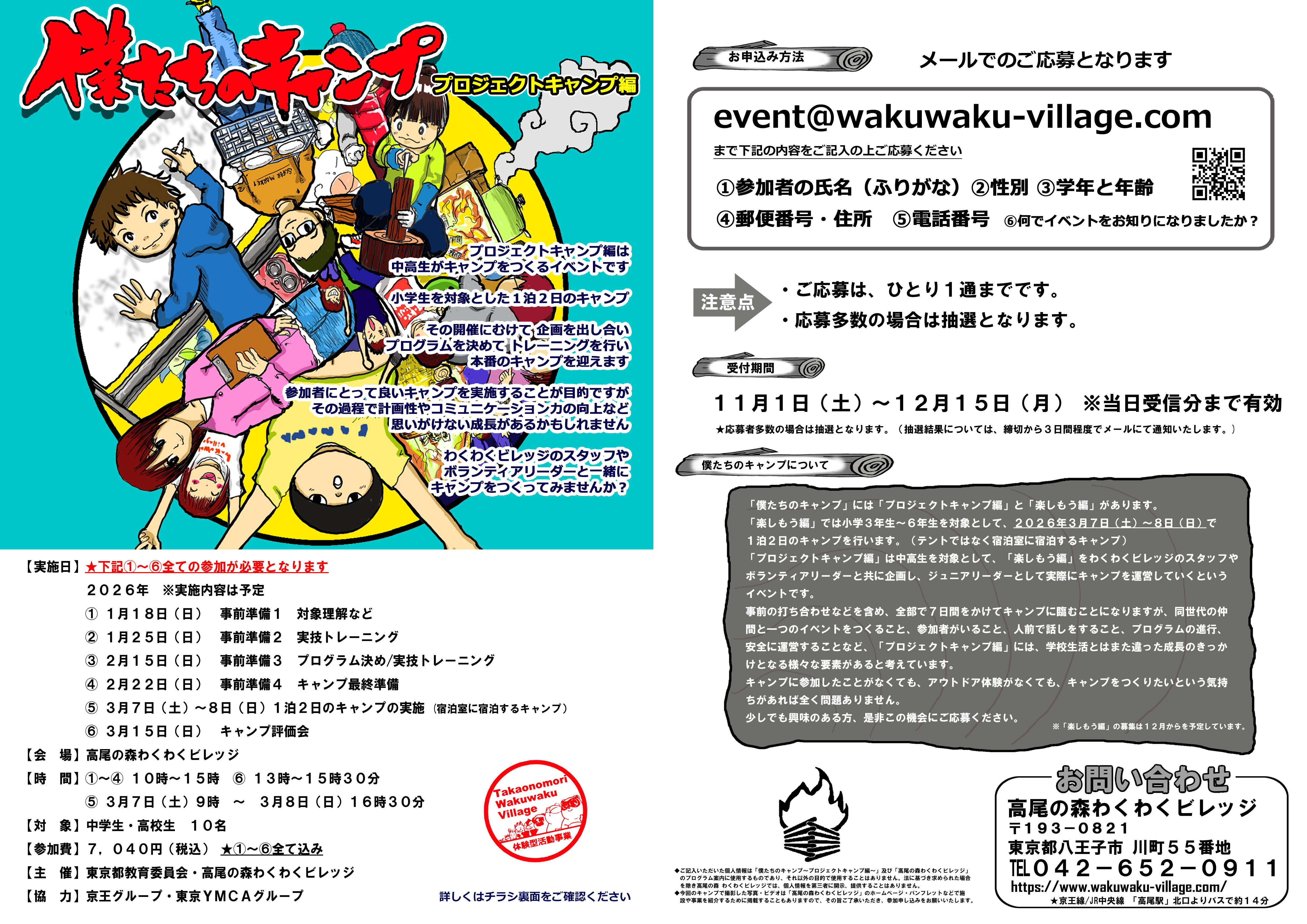 「プロジェクトキャンプ編」は、中高生を対象に、「楽しもう編」をわくわくビレッジスタッフやボランティアリーダーと共に企画し、ジュニアリーダーとして実際にキャンプを運営していく、というイベントです。