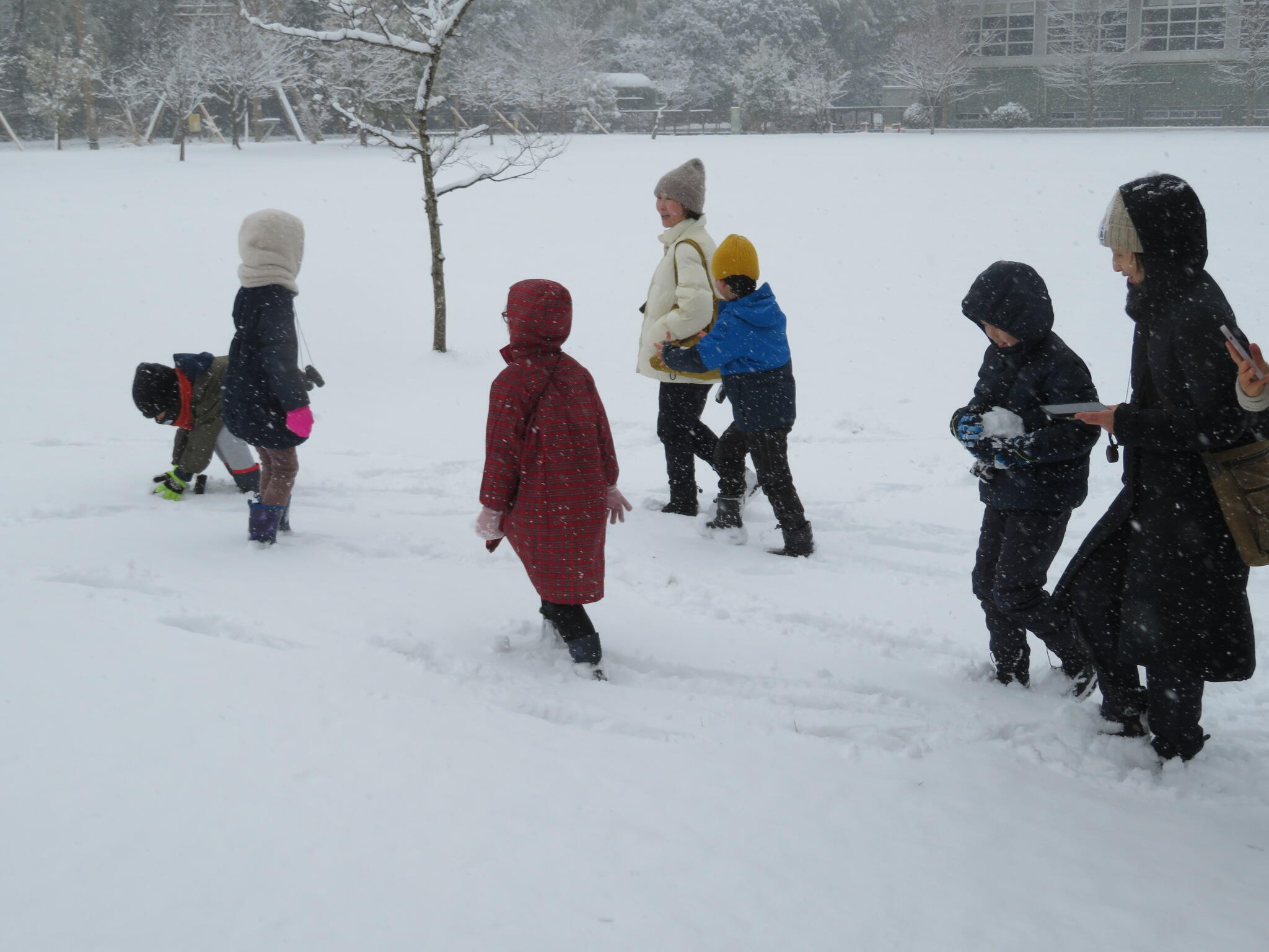 調査隊のチラシの絵と同じような雪景色の中へ防寒着を着て双眼鏡を持って調査に出発しました。