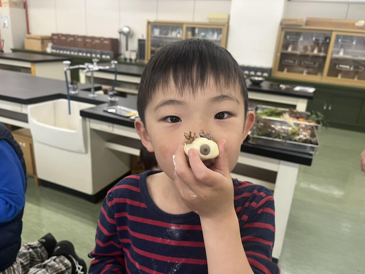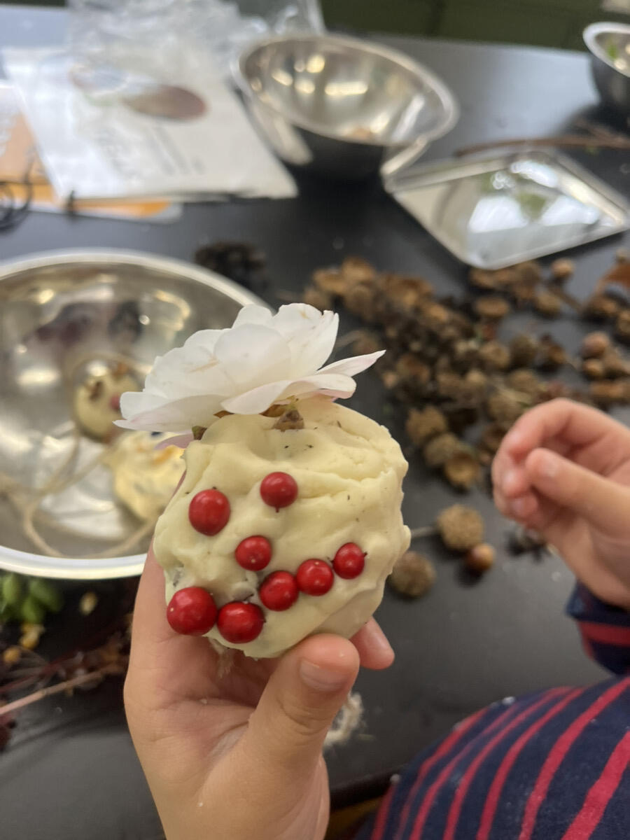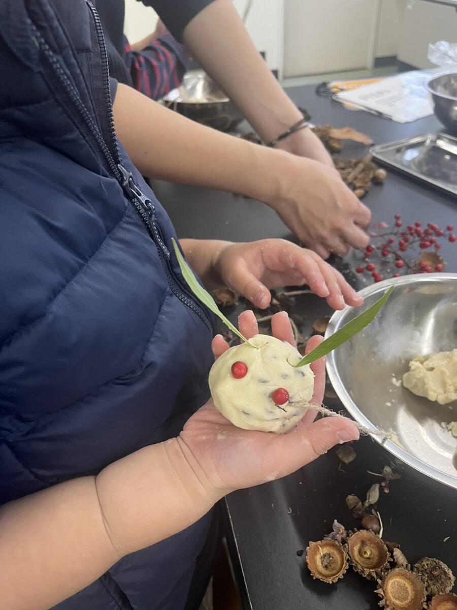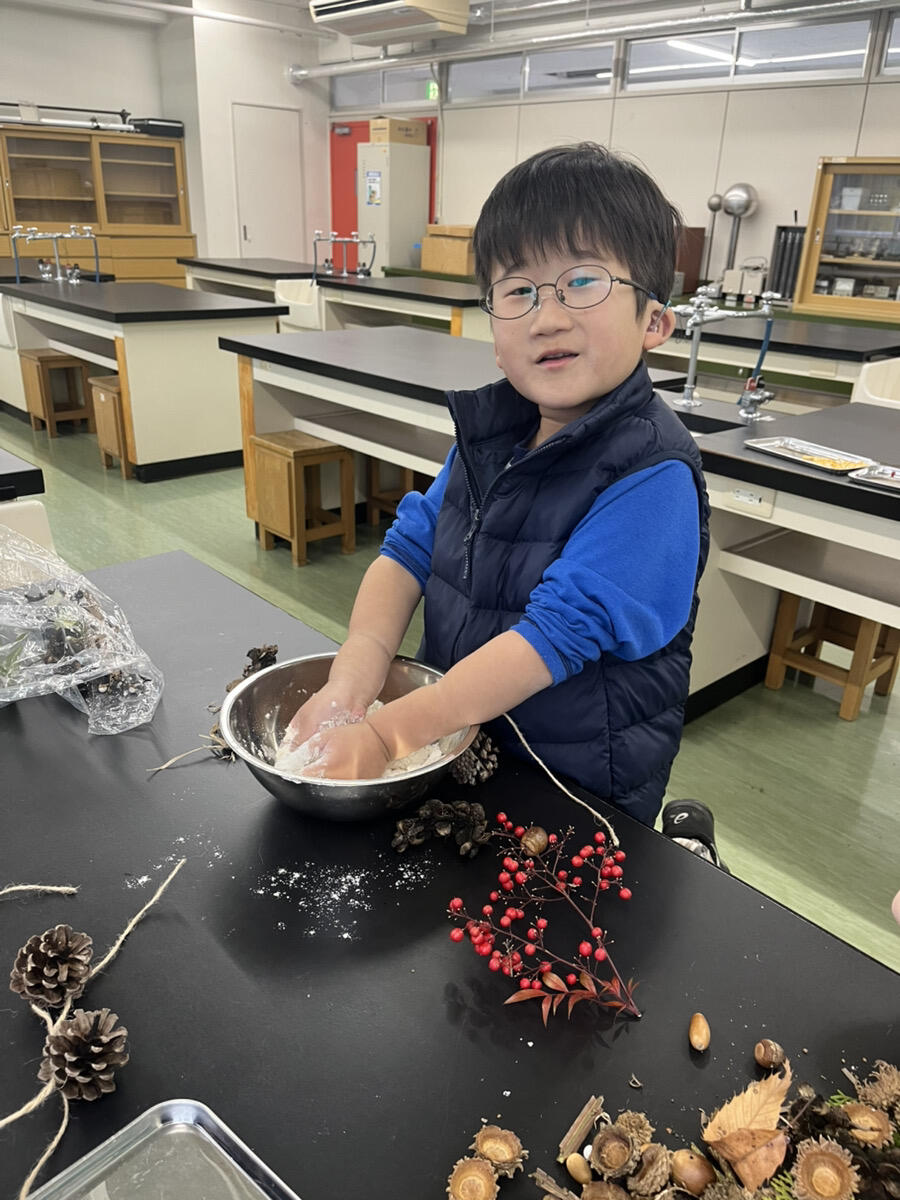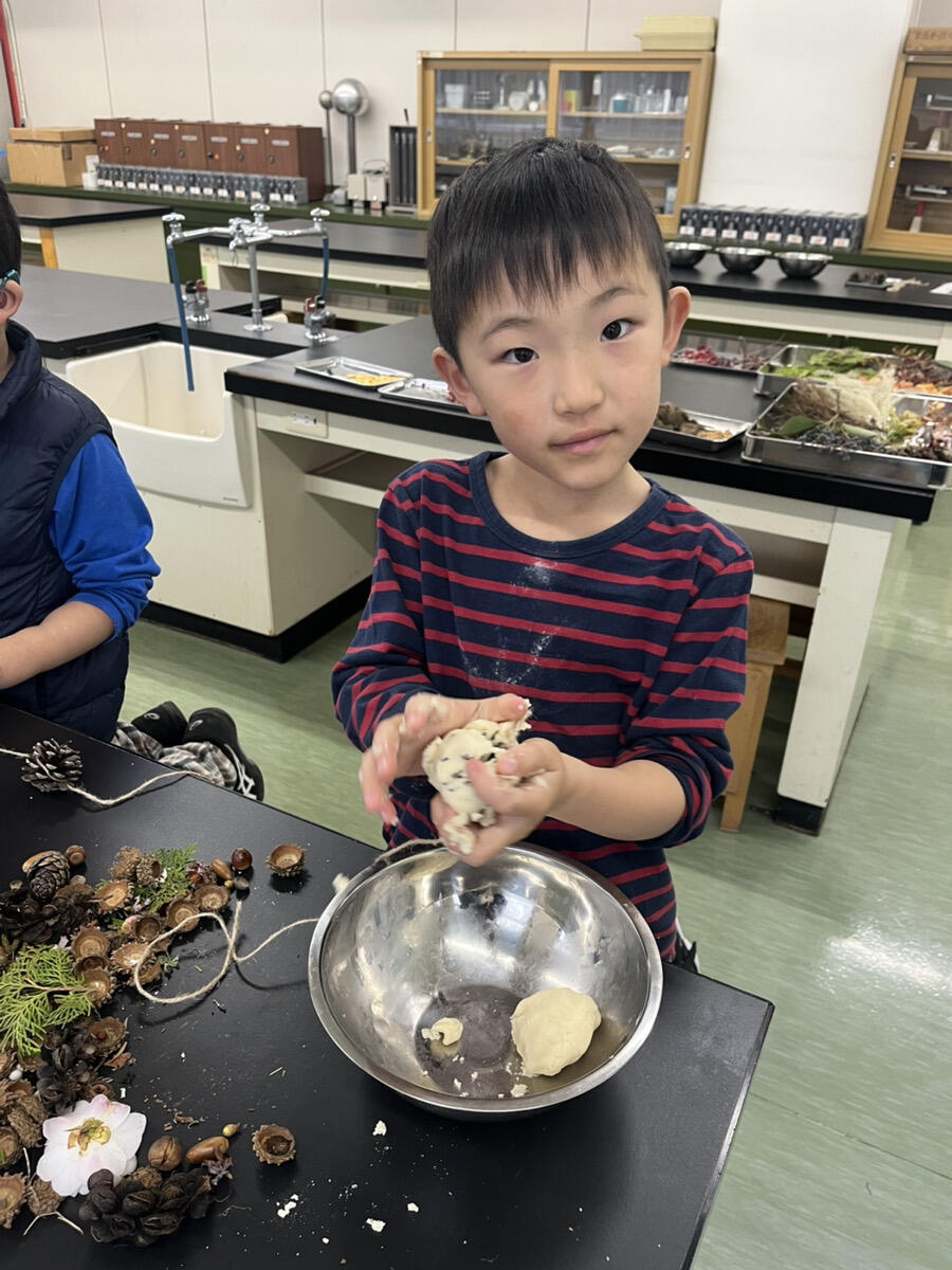 野外で集めた自然物と小麦粉などを混ぜてバードケーキを作ります。